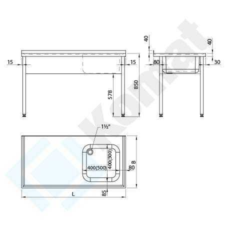 Stół ze zlewem 1-komorowym, bez półki dolnej. Blat z rantem z tyłu h=40 mm, z zagłębieniem na całej powierzchni. Maskownica frontowa pod blatem. Standardowa wysokość stołu H=850 mm.
