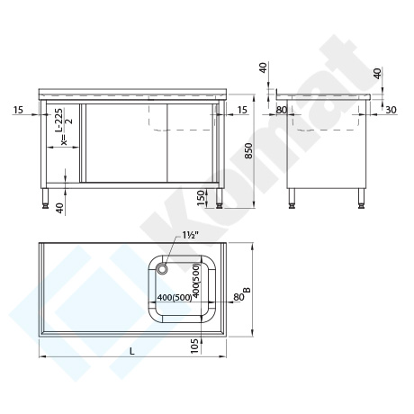 Stół ze zlewem 1-komorowym, z szafką z drzwiami suwanymi, bez pleców i półki przestawnej. Blat z rantem z tyłu h=40 mm, z zagłębieniem na całej powierzchni. Standardowa wysokość stołu H=850 mm.