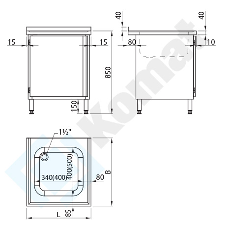 Stół ze zlewem 1-komorowym z modułem z szafką z drzwiami skrzydłowymi, bez półki i pleców. Blat z rantem z tyłu h=40 mm, z zagłębieniem na całej powierzchni. Standardowa wysokość stołu H=850 mm.