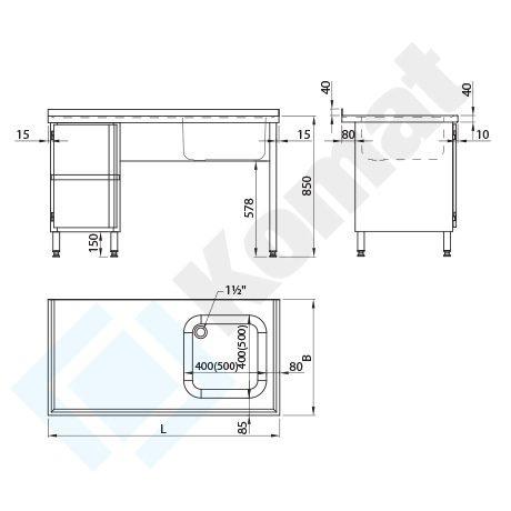 Stół ze zlewem 1-komorowym z modułem z szafką z drzwiami skrzydłowymi, z półką dolną h=150 mm. Blat z rantem z tyłu h=40 mm, z zagłębieniem na całej powierzchni. Standardowa wysokość stołu H=850 mm.