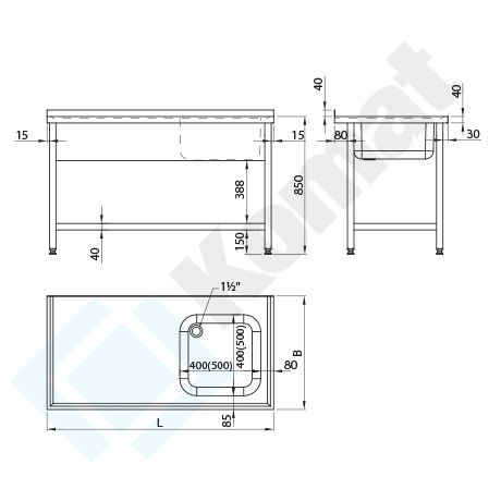 Stół ze zlewem 1-komorowym, z półką dolną h=150 mm. Blat z rantem z tyłu h=40 mm, z zagłębieniem na całej powierzchni. Maskownica frontowa pod blatem. Standardowa wysokość stołu H=850 mm.