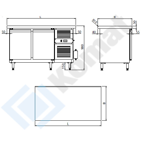 Stół chłodniczny z bocznym agregatem, z prawej lub lewej strony. Blat centralny bez rantu o grubości 50mm, przygotowany do skręcenia na włos z blatami sąsiednimi. Wykonanie AISI 304. Zakres regulacji temp. od -2 do +10 st. C.