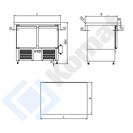 Stół chłodniczny z dolnym agregatem. Blat centralny bez rantu o grubości 50mm, przygotowany do skręcenia na włos z blatami sąsiednimi. Wykonanie stal nierdzewna AISI 304. Zakres regulacji temp. od -2 do +10 st. C.