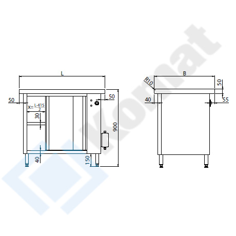 Stół grzewczy z szafką z drzwiami suwanymi. Pojedyncza półka przestawna. Blat centralny bez rantu o grubości 50mm, przygotowany do skręcenia na włos z blatami sąsiednimi. Wykonanie AISI 304. Zakres regulacji temp. od 30 do 95 st. C.