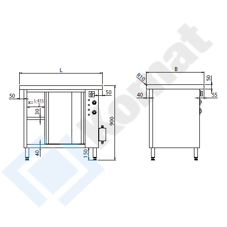 Stół grzewczy z płytą grzewczą, z szafką z drzwiami suwanymi. Blat centralny bez rantu o grubości 50mm, przygotowany do skręcenia na włos z blatami sąsiednimi. Wykonanie AISI 304. Temp. szafki: 30-95 st. C. Temp. płyty: 30-60 st. C.