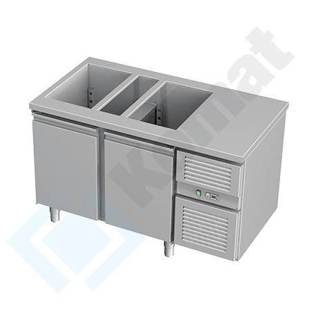 - komory chłodnicze wyposażone standardowo w drzwi skrzydłowe izolowane pełne o grubości 40mm, z uszczelką – możliwość zamiany na 2 lub 3 szuflady w zależności od typu stołu,