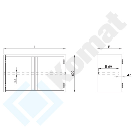 Szafka wisząca otwarta z drzwiami skrzydłowymi, z półką przestawną. Standardowa wysokość szafki H=600 mm.