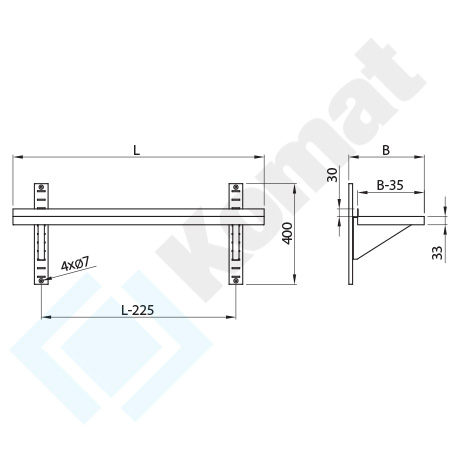 Półka 1-poziomowa wisząca na konsolach ściennych, przestawna. W standardzie półka pełna, rant tyl h=30 mm.
