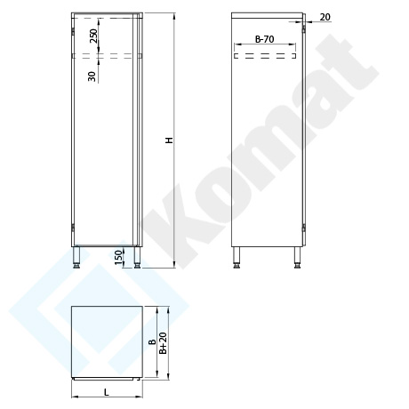 - nogi H=150mm wykonane z profili 40x40x1,2mm, zakończone stopą z Poliamidu PA6 z regulacją wysokości w zakresie -10/+20mm