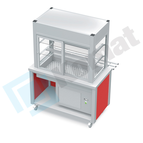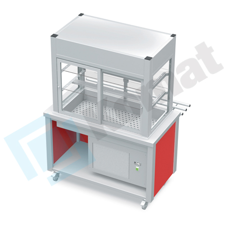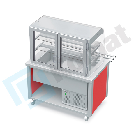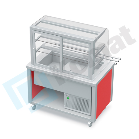 Stanowisko z witryną chłodniczą z wanną - witryna z klapkami uchylnymi, szyba gięta
