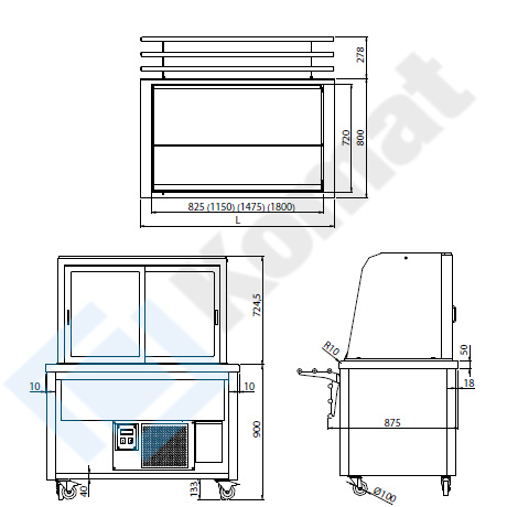 Mobilna witryna chłodnicza na podstawie otwartej. Pełna gięta szyba od frontu, drzwi suwane od strony obsługi. Zabudowa dekoracyjna MDF z 3-stron. Dwie półki przeszklone z oświetleniem LED. Uchylna prowadnica tac.