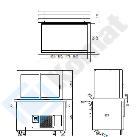 Mobilna witryna chłodnicza na podstawie otwartej. Pełna prosta szyba od frontu, drzwi suwane od strony obsługi. Zabudowa dekoracyjna MDF z 3-stron. Dwie półki przeszklone z oświetleniem LED. Uchylna prowadnica tac.
