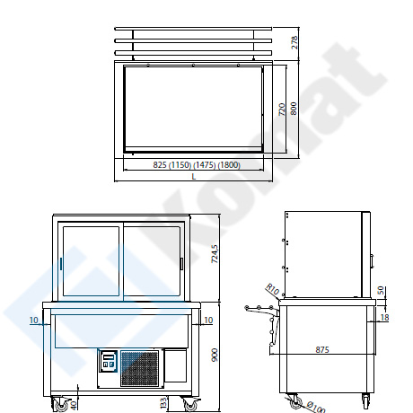 Mobilna witryna chłodnicza na podstawie otwartej. Klapki uchylne od frontu-szyba prosta, drzwi suwane od strony obsługi. Zabudowa dekoracyjna MDF z 3-stron. Dwie półki przeszklone z oświetleniem LED. Uchylna prowadnica tac.