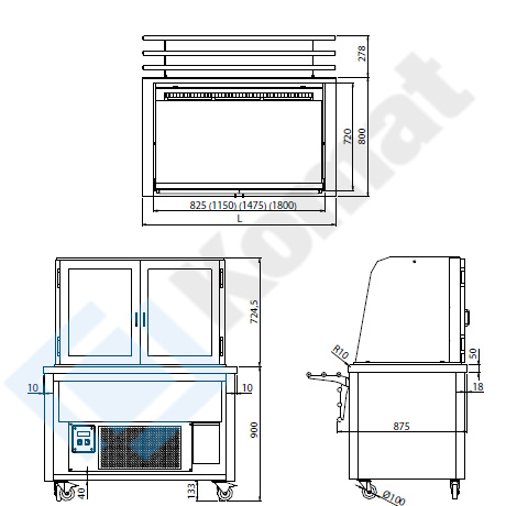 Mobilna witryna chłodnicza na podstawie otwartej. Otwarta od frontu-szyba gięta, drzwi suwane od strony obsługi. Zabudowa dekoracyjna MDF z 3-stron. Dwie półki przeszklone z oświetleniem LED. Uchylna prowadnica tac.