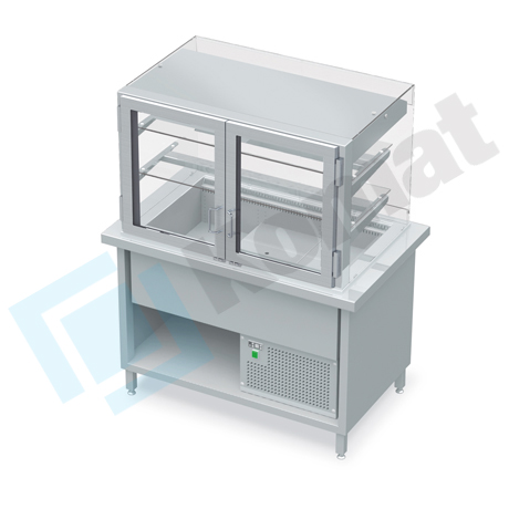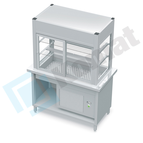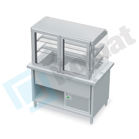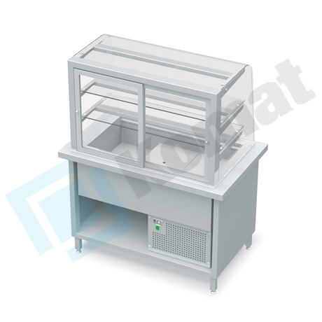 Stanowisko z witryną chłodniczą z wanną - witryna z klapkami uchylnymi, szyba gięta