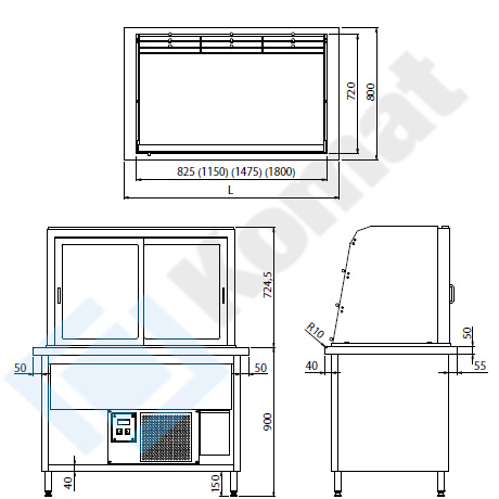 Przeszklona witryna chłodnicza z wanną wspawaną w blat. Szafka otwarta. Gięty front z klapkami uchylnymi, drzwi suwane od strony obsługi. Agregat chłodniczy w części dolnej. Dwie półki przeszklone. Wewnętrzne oświetlenie LED.