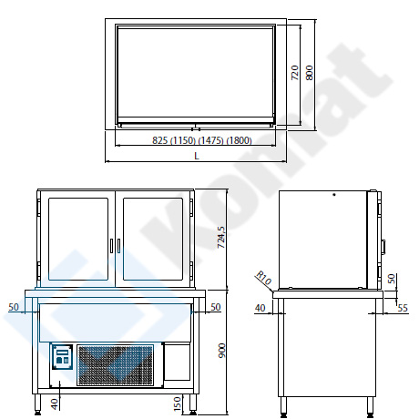Przeszklona witryna chłodnicza z wanną wspawaną w blat. Szafka otwarta. Prosty otwarty front, drzwi skrzydłowe od strony obsługi. Agregat chłodniczy w części dolnej. Dwie półki przeszklone. Wewnętrzne oświetlenie LED.