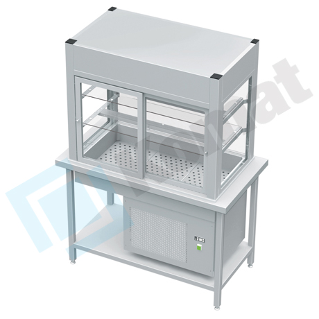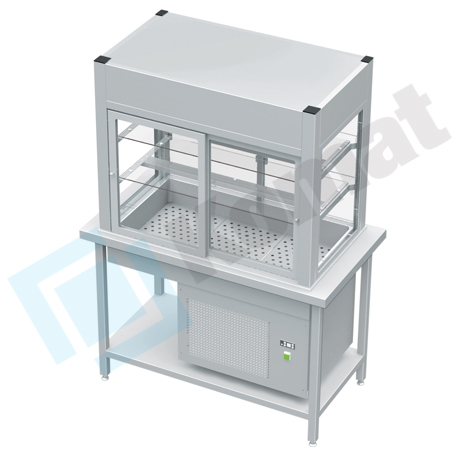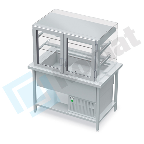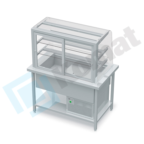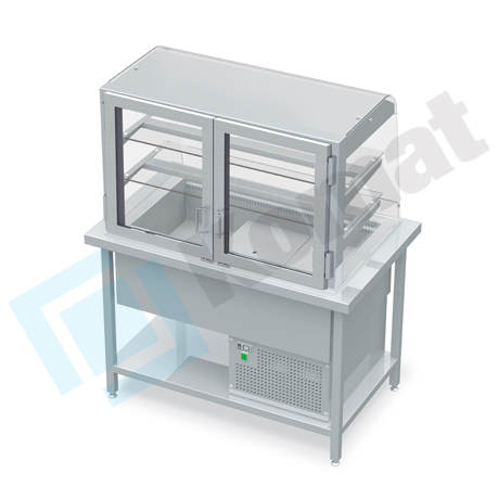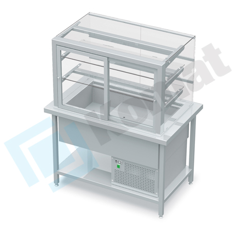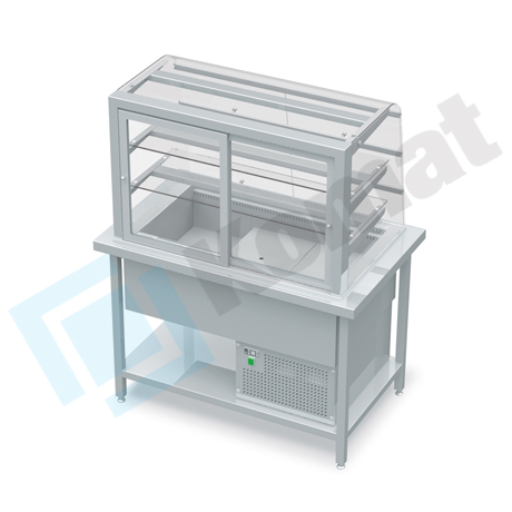 Stanowisko z witryną chłodniczą z wanną - witryna z klapkami uchylnymi, szyba gięta