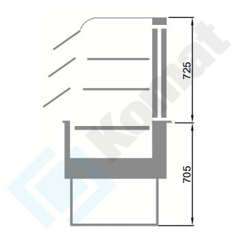 Witryna chłodnicza przeszklona, na podstawie otwartej, z klapkami uchylnymi - gięty front, i drzwiami suwanymi. Wanna chłodnicza na spodzie witryny. Własny agregat chłodniczy. Dwie półki przeszklone, wraz z oświetleniem LED.