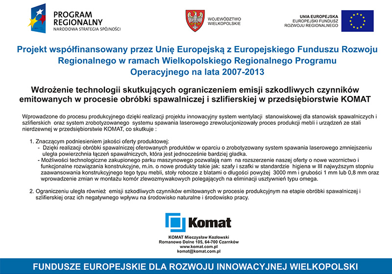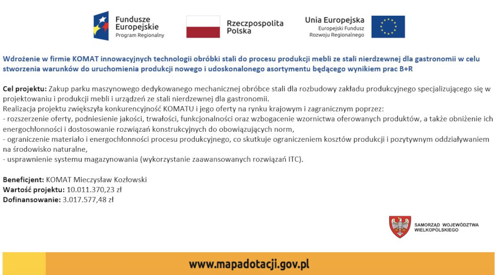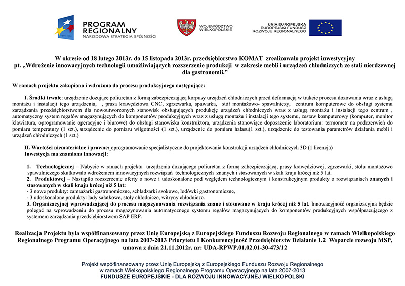 OPIS PROJEKTU: Celem projektu jest wdrożenie systemu B2B do obsługi procesów biznesowych zachodzących na linii KOMAT – DOSTAWCY. Planujemy wdrożyć system wykorzystujący innowacyjne systemy teleinformatyczne umożliwiające automatyzację procesów biznesowych oraz koordynację działań między KOMATEM – producentem mebli i urządzeń ze stali nierdzewnej dla gastronomii, a jego głównymi DOSTAWCAMI surowców i komponentów wykorzystywanych w procesie produkcyjnym.