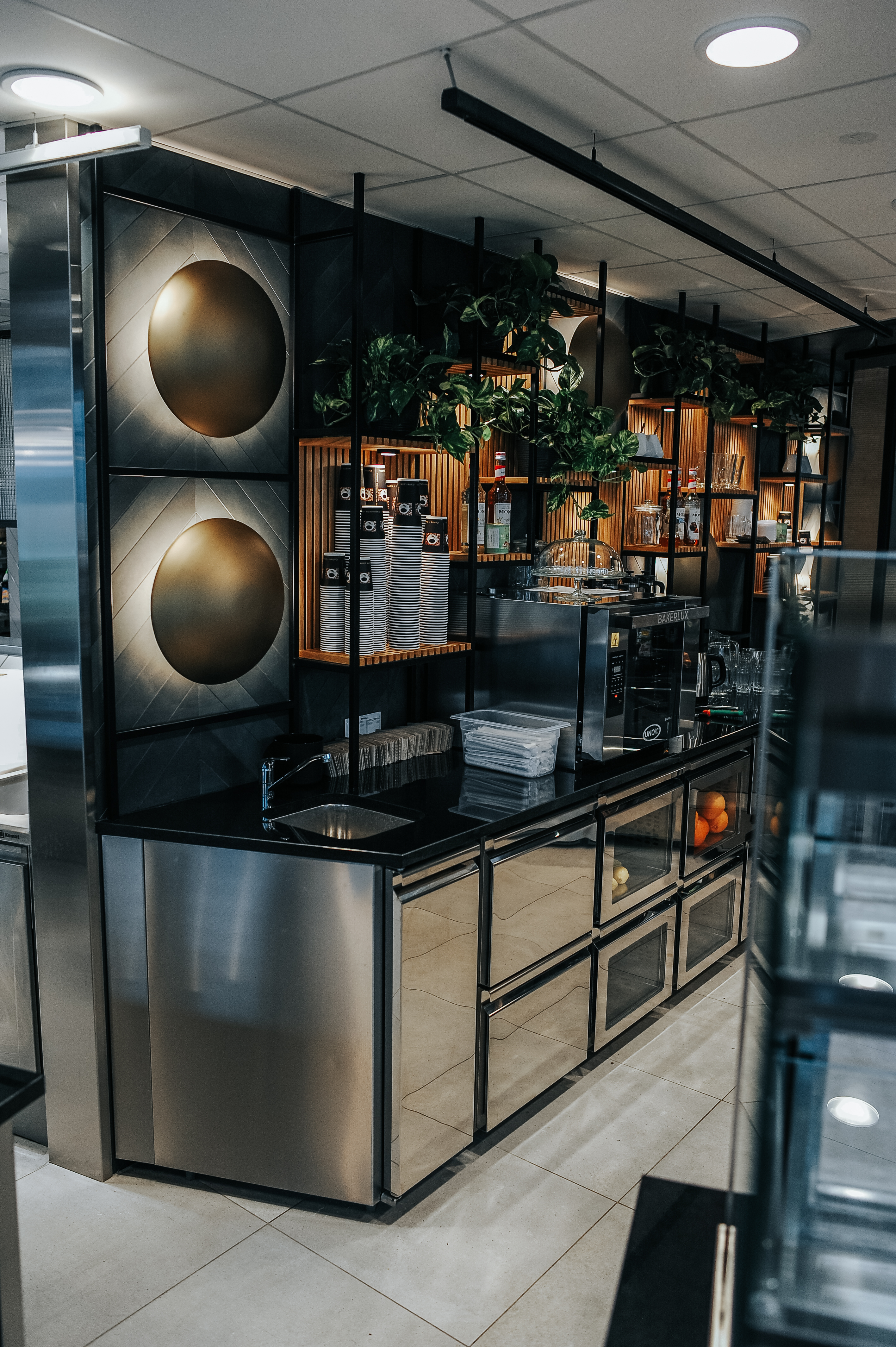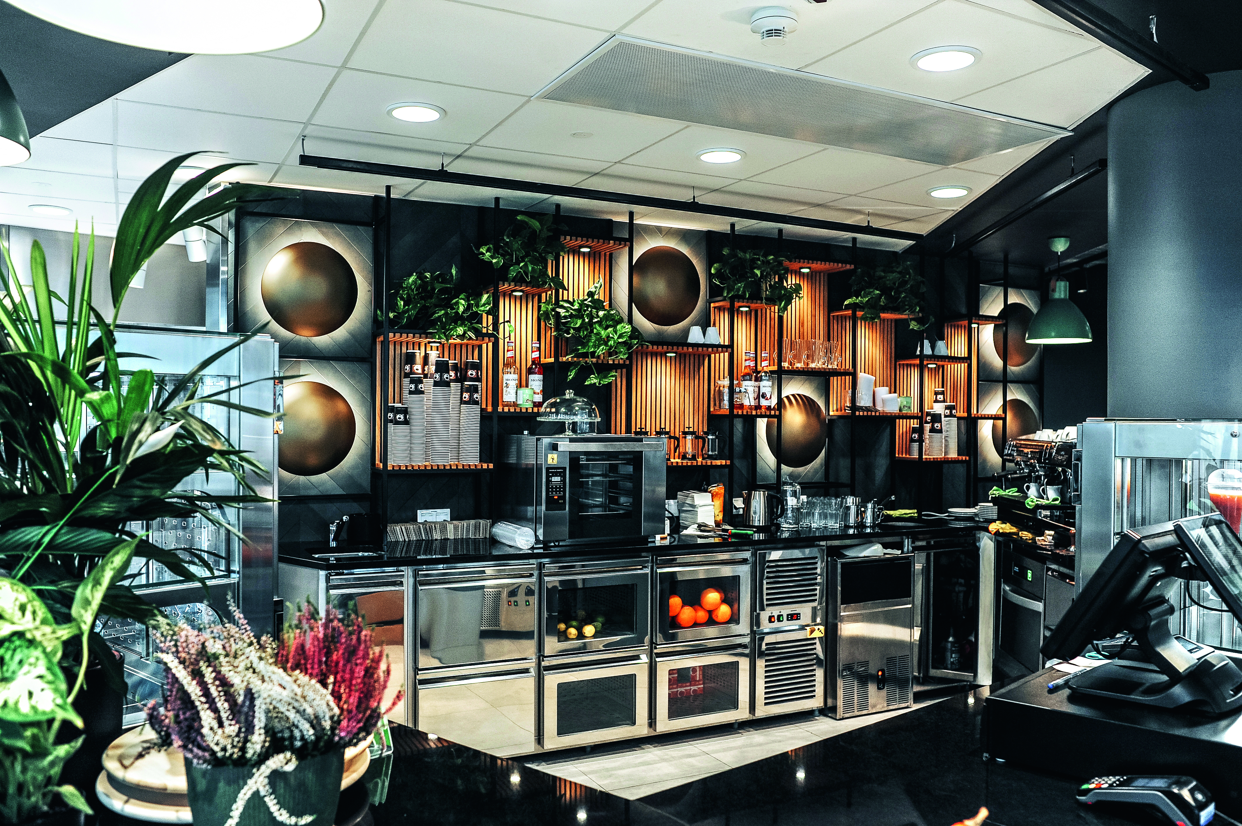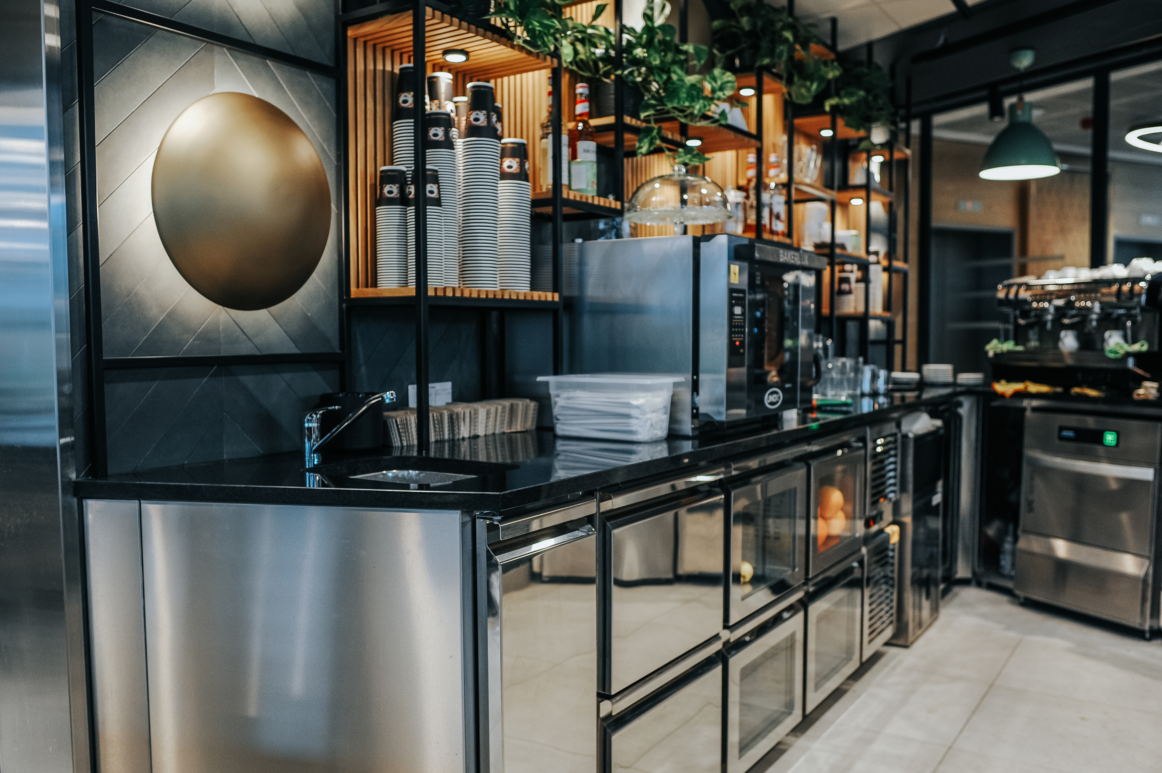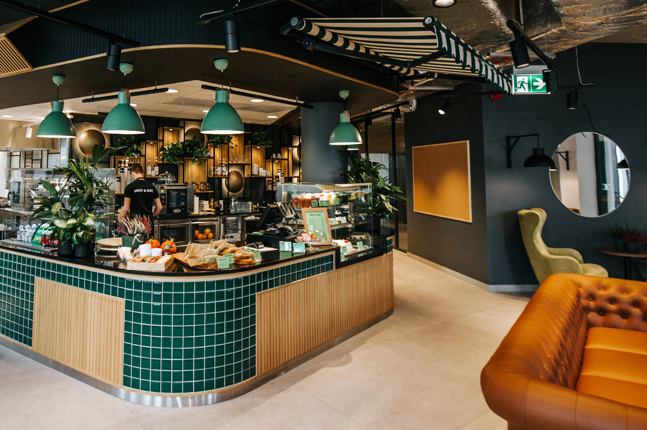 Dzięki realizacji Komat, przestrzeń gastronomiczna w Business Garden Warszawa zyskała nowoczesne i funkcjonalne wyposażenie, które odpowiada na potrzeby użytkowników kompleksu. Linia barowa została zaprojektowana z myślą o estetyce i ergonomii, wpisując się w wysoki standard całego obiektu.