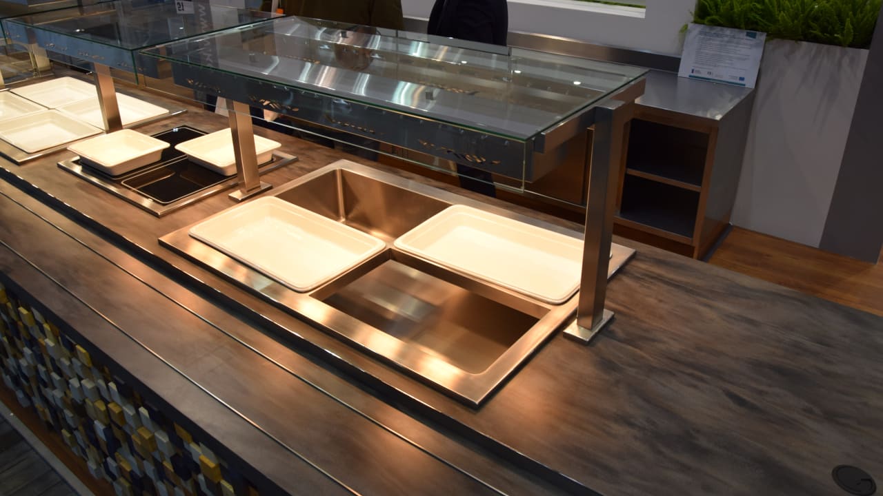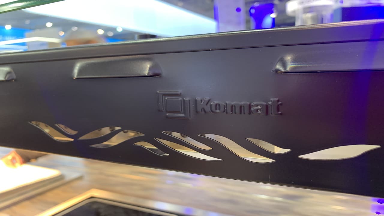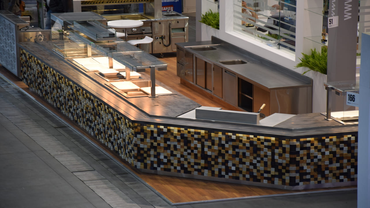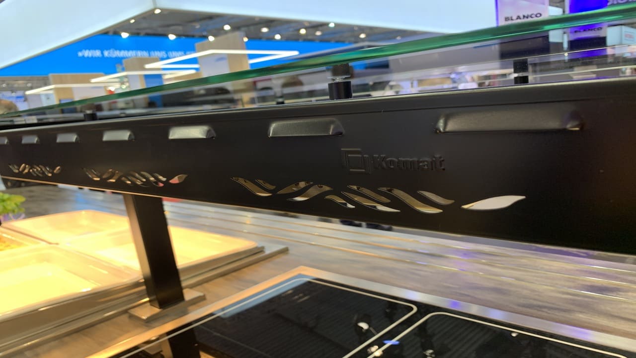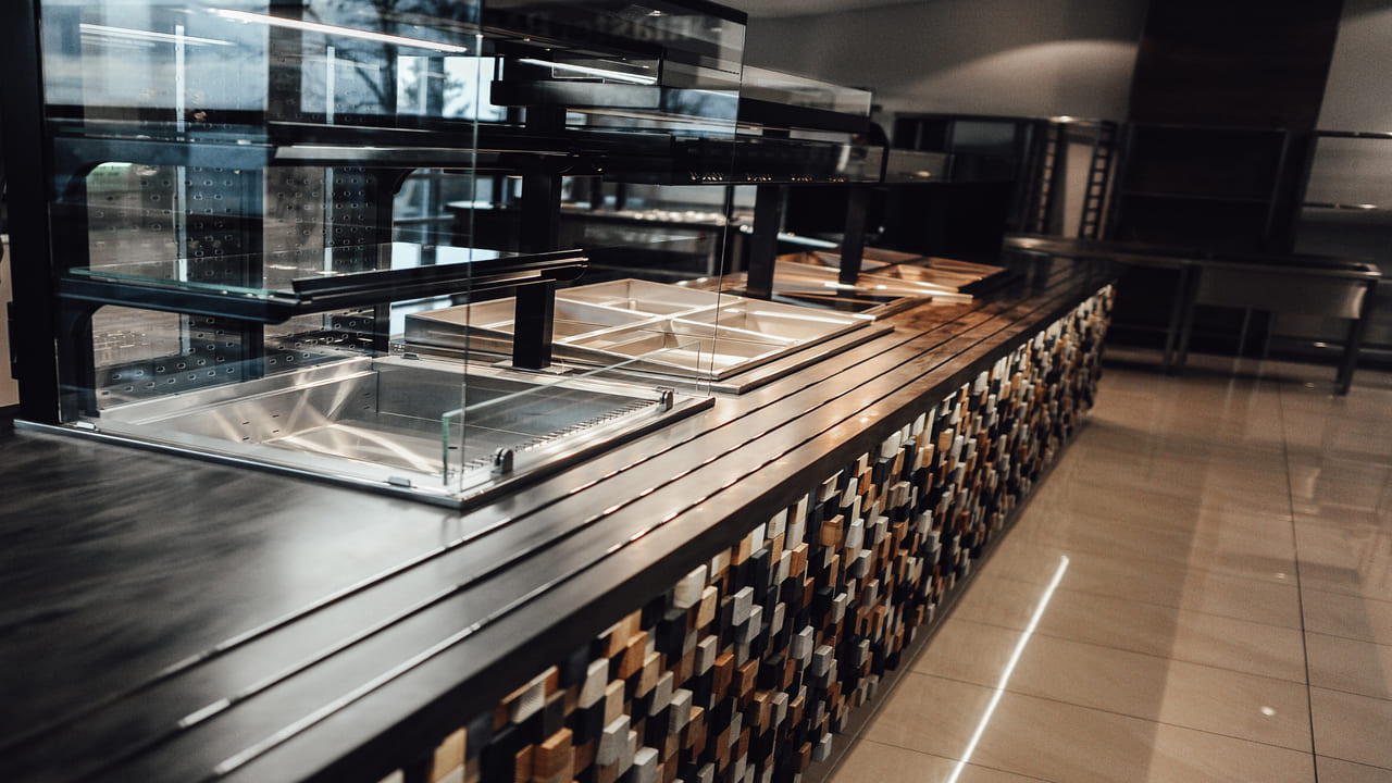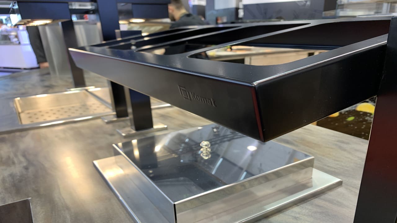 Prezentowana linia wydawcza to połączenie nowoczesnego designu z najwyższą jakością wykonania. Konstrukcja została malowana proszkowo na kolor czarny, co nadaje jej wyjątkowy charakter i podkreśla prestiż wnętrza. Uwagę przykuwa także elegancki front wykonany z przestrzennych elementów dekoracyjnych, które nadają całości głębi i unikalnego stylu. Rozwiązanie to doskonale sprawdza się w reprezentacyjnych strefach gastronomicznych – zarówno w biurowcach, jak i hotelach czy obiektach usługowych.