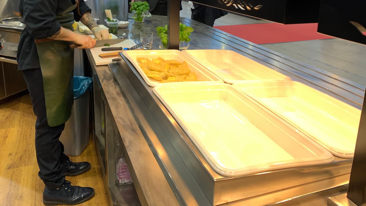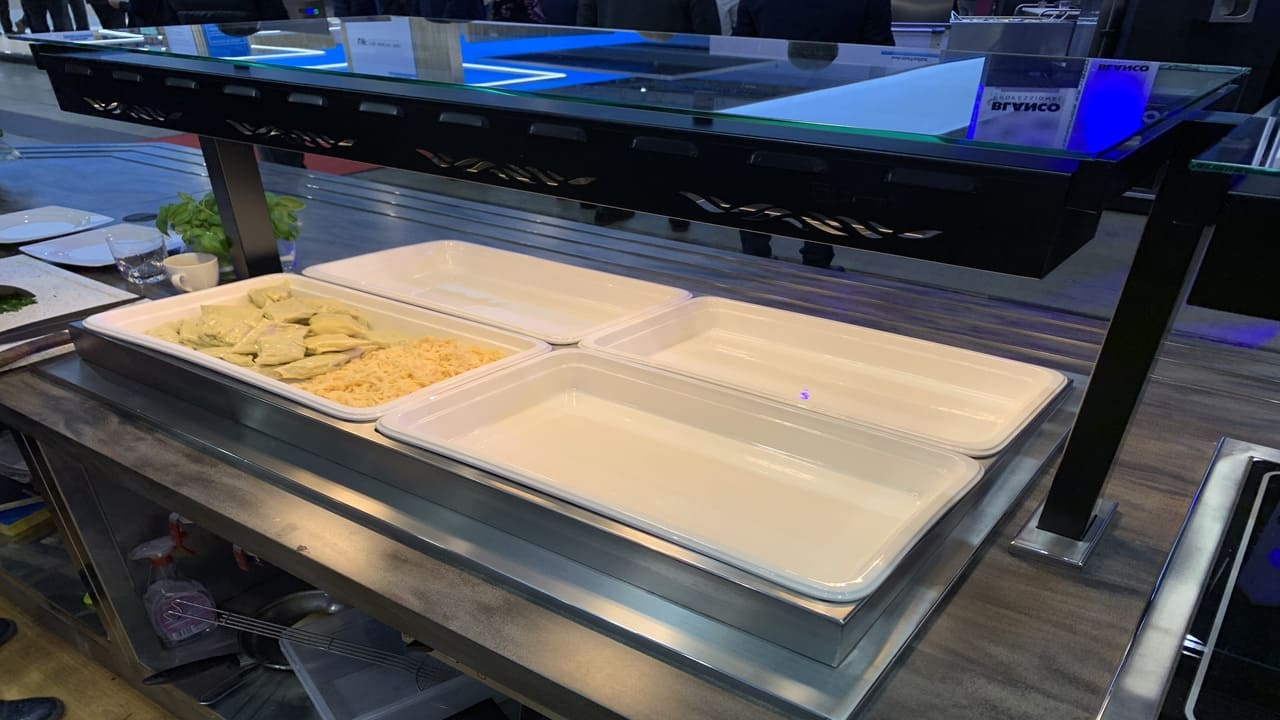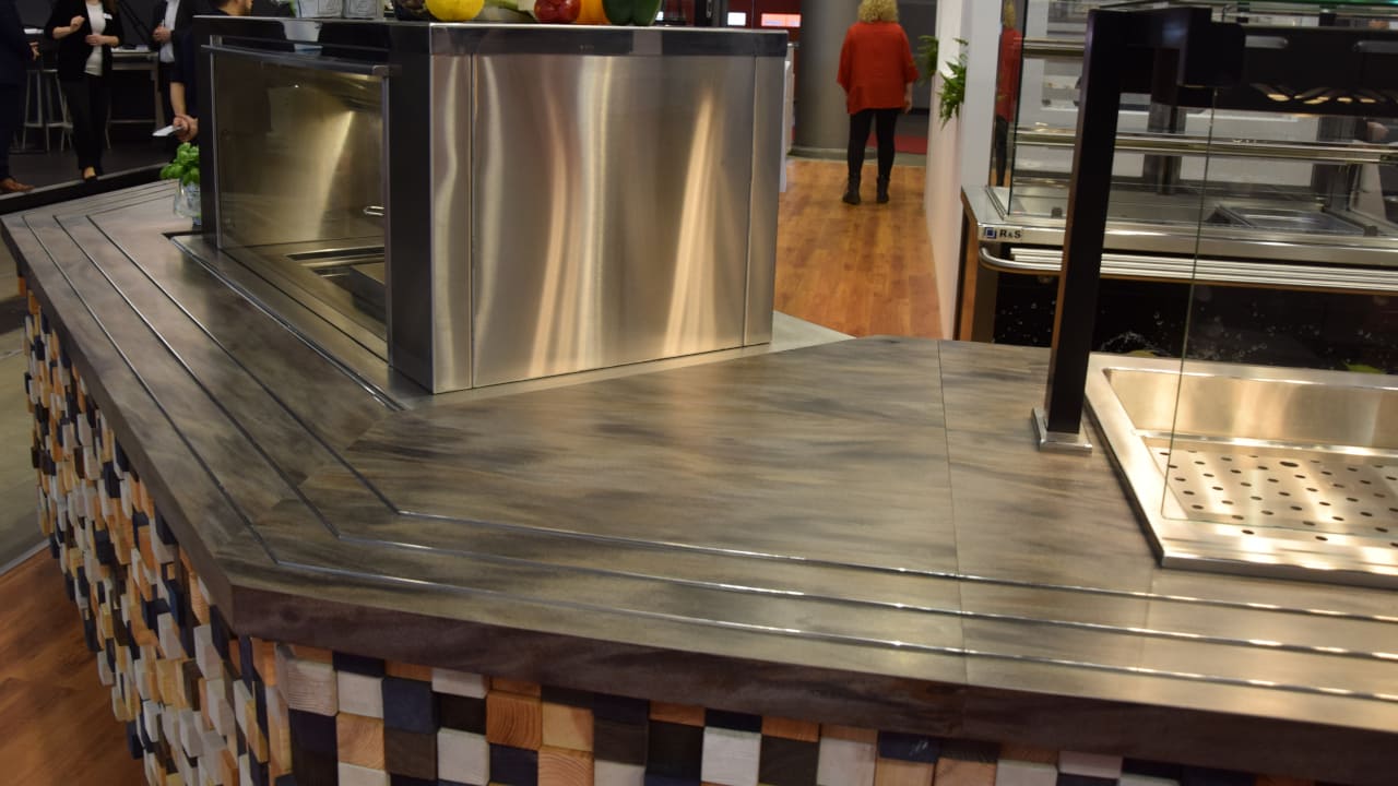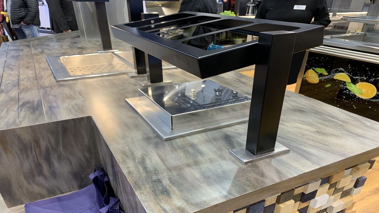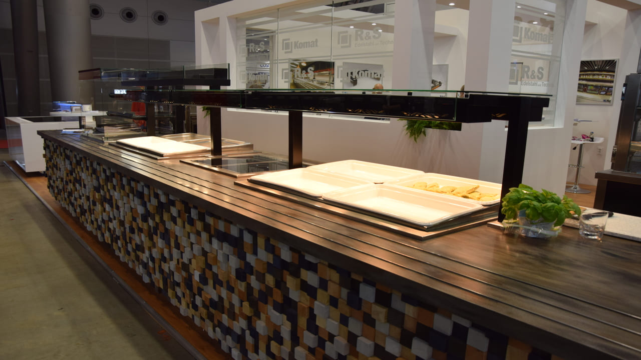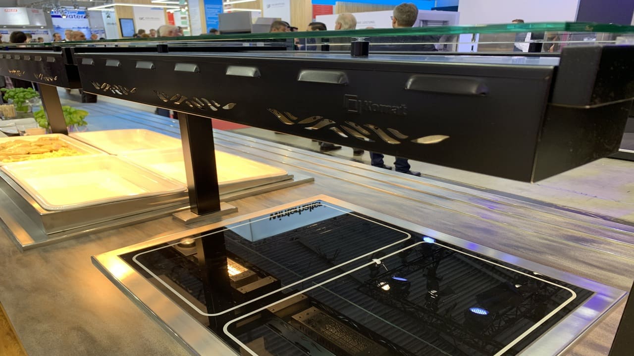 Prezentowana linia wydawcza to połączenie nowoczesnego designu z najwyższą jakością wykonania. Konstrukcja została malowana proszkowo na kolor czarny, co nadaje jej wyjątkowy charakter i podkreśla prestiż wnętrza. Uwagę przykuwa także elegancki front wykonany z przestrzennych elementów dekoracyjnych, które nadają całości głębi i unikalnego stylu. Rozwiązanie to doskonale sprawdza się w reprezentacyjnych strefach gastronomicznych – zarówno w biurowcach, jak i hotelach czy obiektach usługowych.